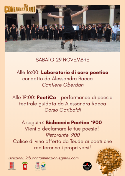 Sabato 29 novembre alle ore 16.00 al cantiere Oberdan si terrà un laboratorio di “coro poetico” e alle ore 19.00 una performance dal titolo “PoetiCo” a Corso Garibaldi. A seguire, sarà possibile partecipare alla “bisboccia poetica – vieni a leggere le tue poesie”, al Ristorante 9cento.