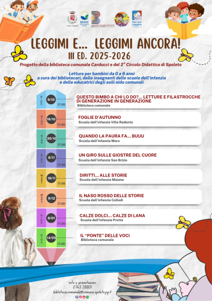 Giunta alla terza edizione, l’iniziativa, organizzata dalla Biblioteca comunale “G. Carducci” e il 2° Circolo Didattico di Spoleto, partner del Patto locale della lettura, si articolerà in 8 incontri a partire dal prossimo 9 ottobre fino a maggio 2026.