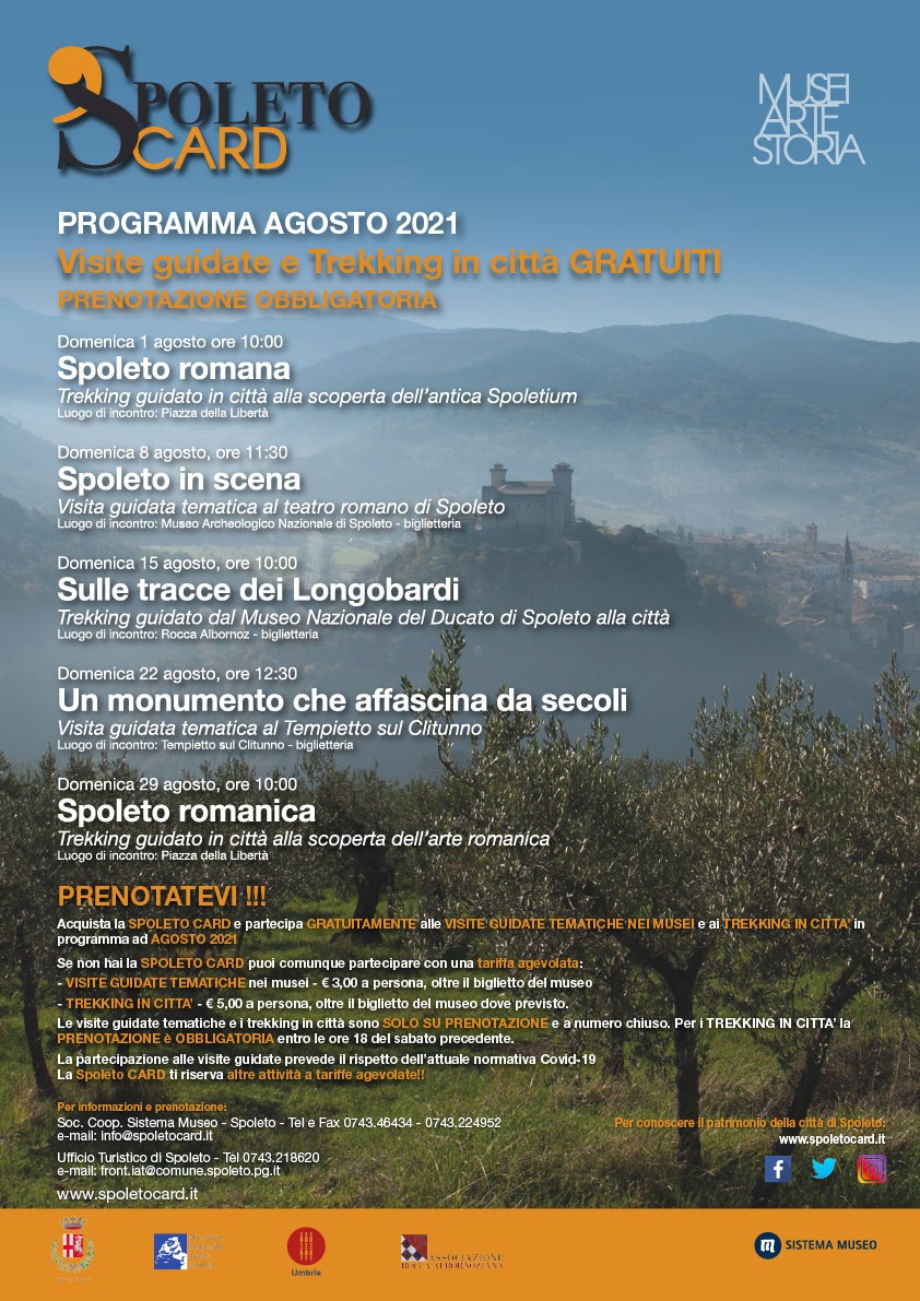 Continuano anche le visite guidate tematiche Capolavori da Museo a cura di Sistema Museo, in collaborazione con la Direzione Regionale Musei dell’Umbria – Rocca Albornoz – Museo Nazionale del Ducato di Spoleto – Tempietto sul Clitunno, il Comune di Spoleto e il Comune di Campello sul Clitunno. Si tratta di speciali visite guidate tematiche alle collezioni dei musei della Spoleto Card.