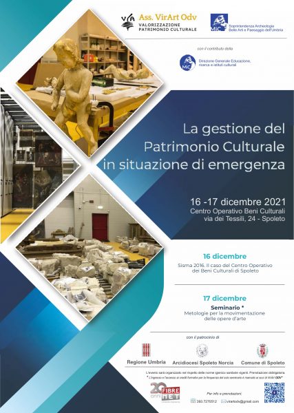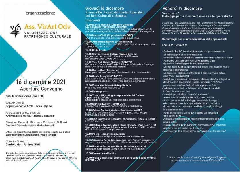 Nel primo giorno, le Istituzioni culturali competenti tratteranno il tema: “Sisma 2016. Il caso del Centro Operativo dei Beni Culturali di Spoleto”, mentre nella seconda giornata si terrà un vero e proprio corso di “Metodologie per la movimentazione delle opere d’arte”, a cura del Prof. Roberto Boddi.