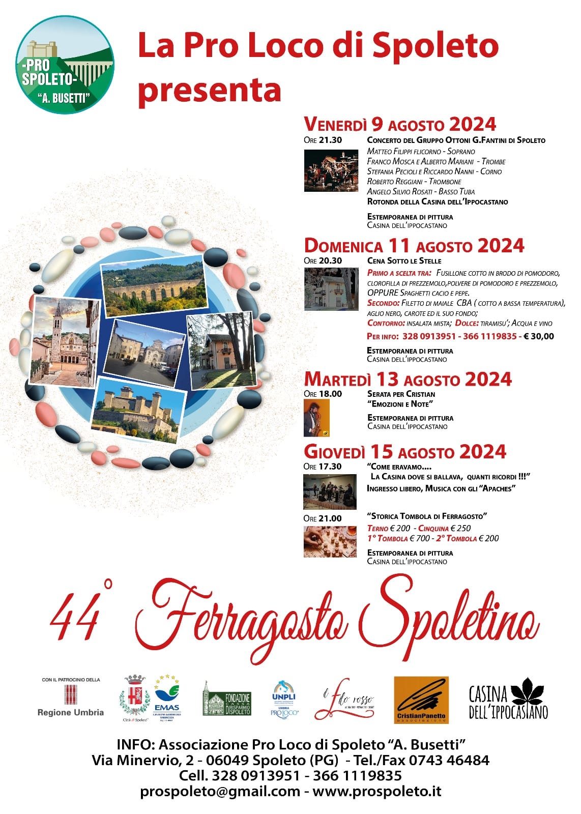 Non mancheranno gli eventi del Ferragosto spoletino organizzati dalla Proloco di Spoleto ‘A. Busetti’, né i momenti di musica itinerante sia con la Spoleto Marching Band a cura della Associazione Spoleto Musica, che con la Fantomatik Orchestra in occasione dell’evento di promozione dei prodotti tipici del progetto Vivi Le Terre Del Ducato Di Spoleto.