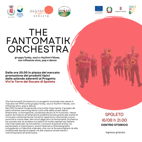 Venerdì 16 agosto dalle 20.00 in piazza del Mercato si terrà la promozione dei prodotti tipici delle aziende aderenti al progetto Vivi le Terre del Ducato di Spoleto, mentre dalle 21.00 le vie del centro storico saranno animate dalla musica di The Fantomatik Orchestra, gruppo funky, soul e rhythm’n’blues, con influenze etno, pop e dance.