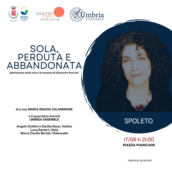 Sabato 17 agosto alle 21.00 in piazza Pianciani, infine, sarà la volta di “Sola, perduta e abbandonata”, una rappresentazione sulla vita e la musica di Giacomo Puccini, a 100 anni dalla scomparsa. Lo spettacolo, di e con Maria Grazia Calandrone, scrittrice e poetessa, finalista del Premio Strega 2023, e il quartetto d’archi Umbria Ensemble (Angelo Cicillini e Cecilia Rossi, Violino; Luca Ranieri, Viola eMaria Cecilia Berioli, Violoncello), propone il punto di vista inedito di una giovane donna, Dora che orfana di padre, viene presa in casa da Puccini come cameriera ma che a 20 anni si toglie la vita.