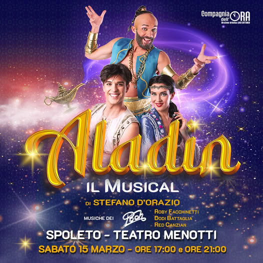 Arriva finalmente a grande richiesta sulle scene dell’Umbria in esclusiva regionale lo spettacolo Aladin – Il musical scritto dalla brillante penna di Stefano D’Orazio con le musiche dei Pooh, Roby Facchinetti, Dodi Battaglia e Red Canzian.