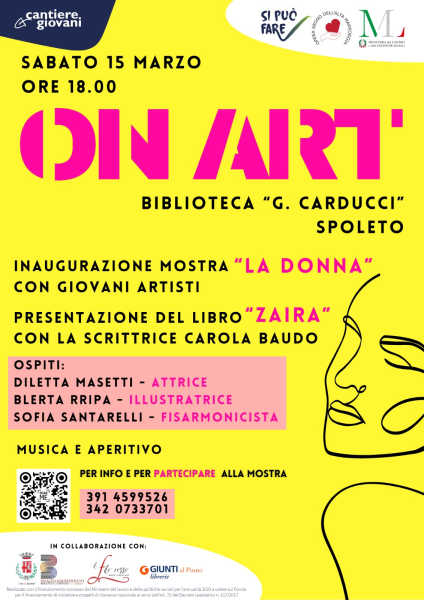 ON ART è il primo degli appuntamenti del Progetto Si può fare che vede l’unione di diverse forme d’arte e passioni di Artiste donne: la presentazione del libro Zaira con la scrittrice Carola Baudo è arricchita dall’interpretazione di Diletta Masetti, dalla creatività di Blerta RRipa e dalla musica di Sofia Santorelli. Verrà inoltre inaugurata la mostra d’arte di giovani artiste ed artisti del Liceo Artistico di Spoleto e non, con momento aperitivo e musica.