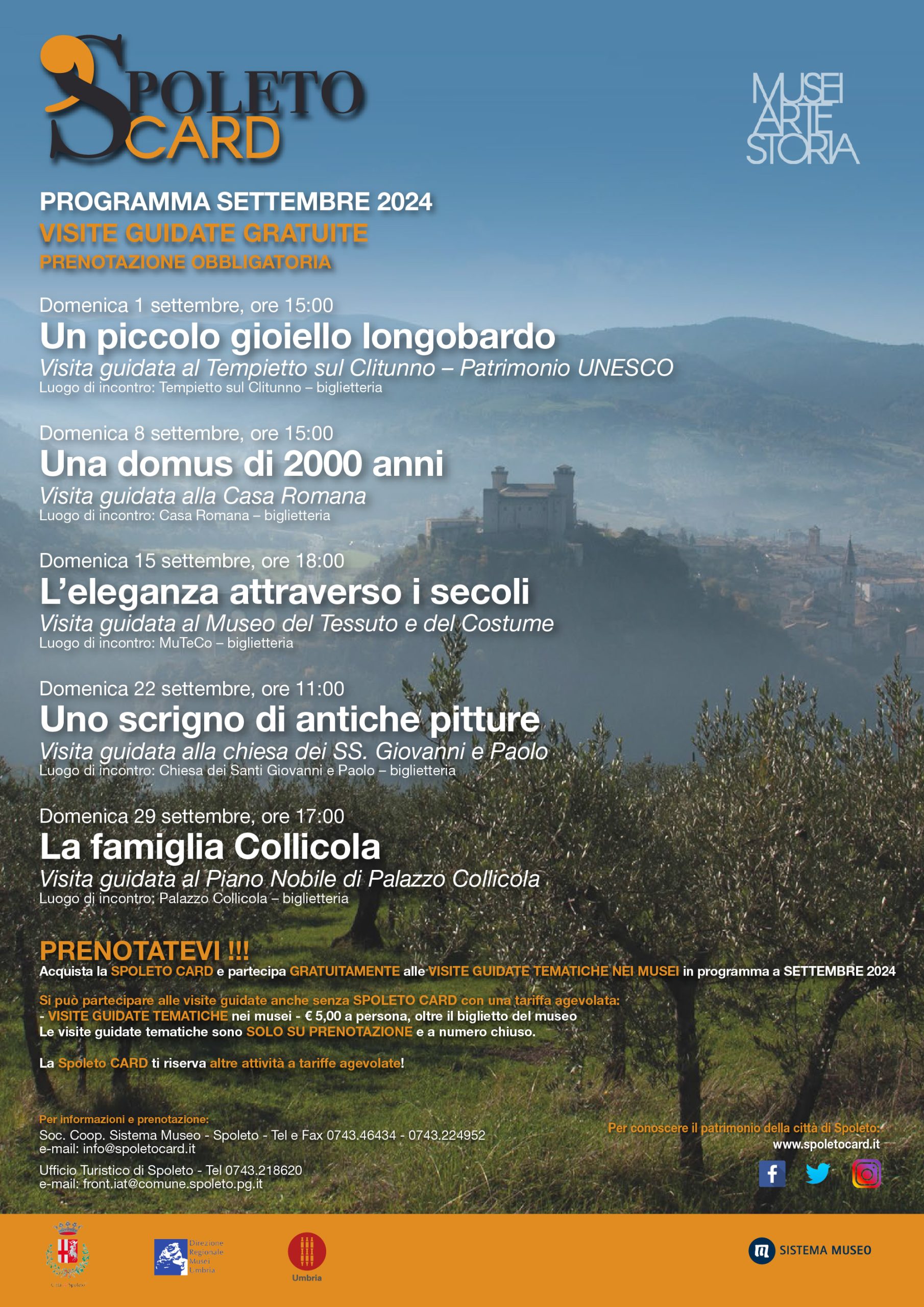 Programma settimanale di visite guidate a tema a cura di Sistema Museo alla scoperta delle preziose testimonianze storico artistiche dei musei di Spoleto e Campello sul Clitunno. Gli appuntamenti settimanali sono previsti nei musei della rete Spoleto Card: la Rocca Albornoz – Museo Nazionale del Ducato di Spoleto, Palazzo Collicola, la Casa Romana, la Chiesa dei Santi Giovanni e Paolo, il Museo del Tessuto e del Costume e il Tempietto sul Clitunno.