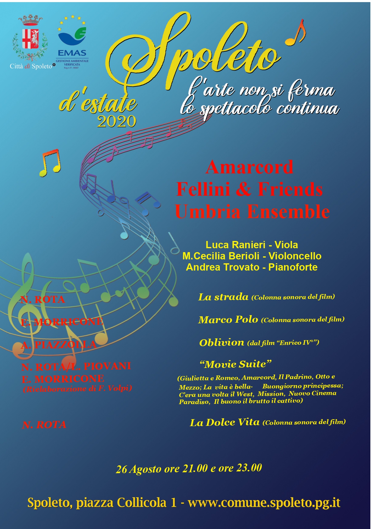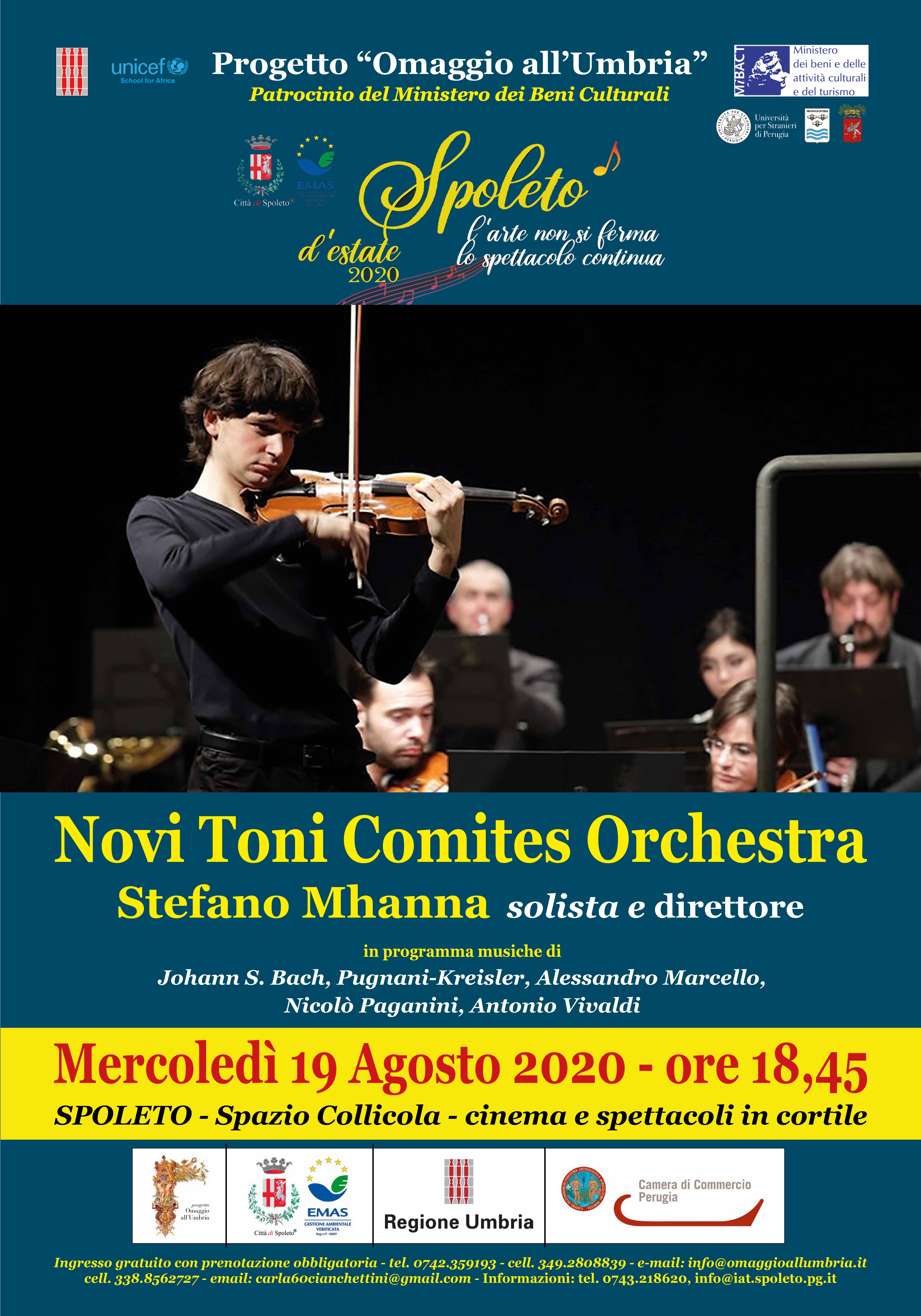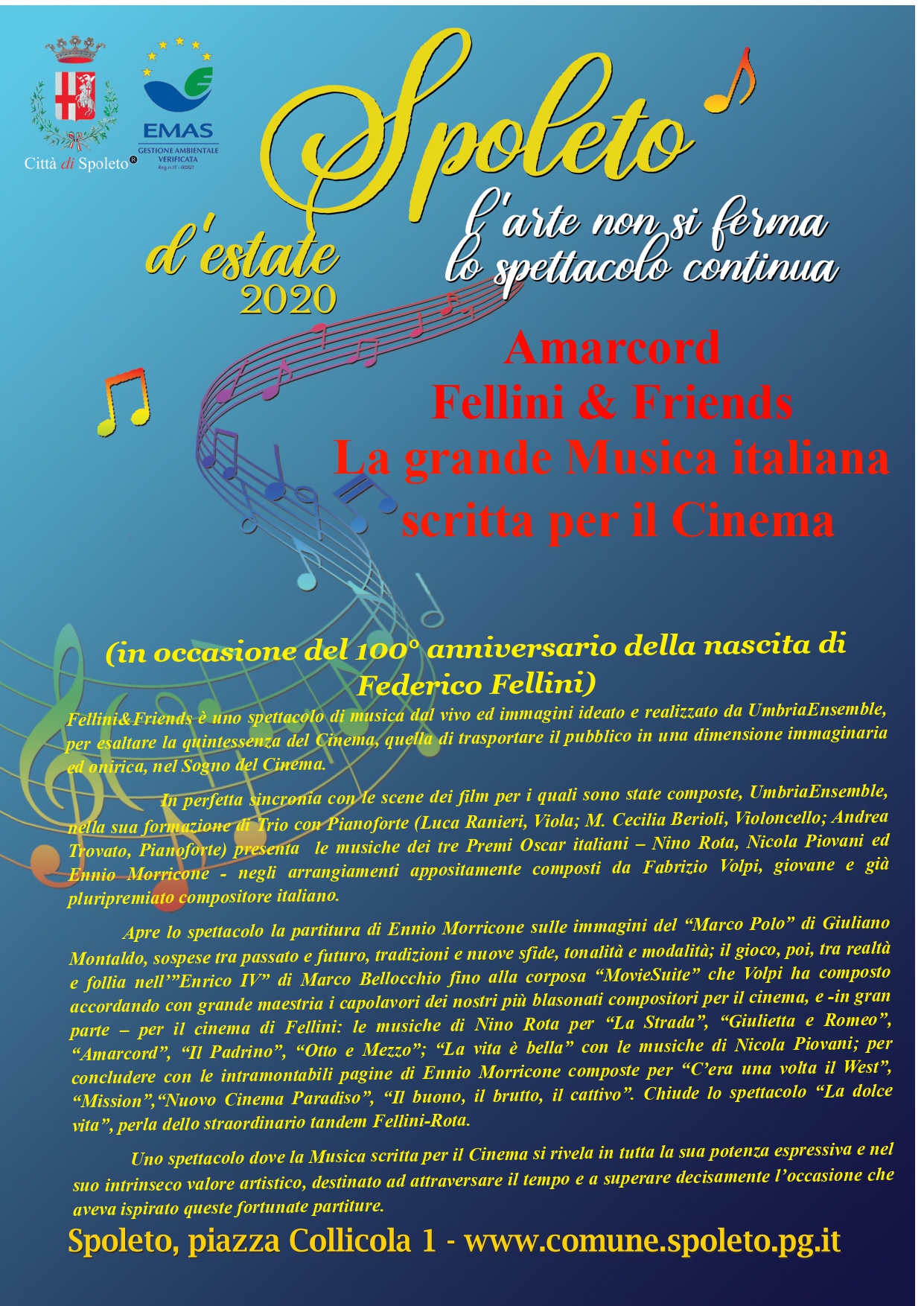 Il Comune di Spoleto, che ha abbracciato le iniziative inserite nel programma proposto dal progetto Omaggio all’Umbria alla Regione, offre all’organizzazione del concerto il Teatro Gian Carlo Menotti inteso nella sua semplice realtà materiale come location .