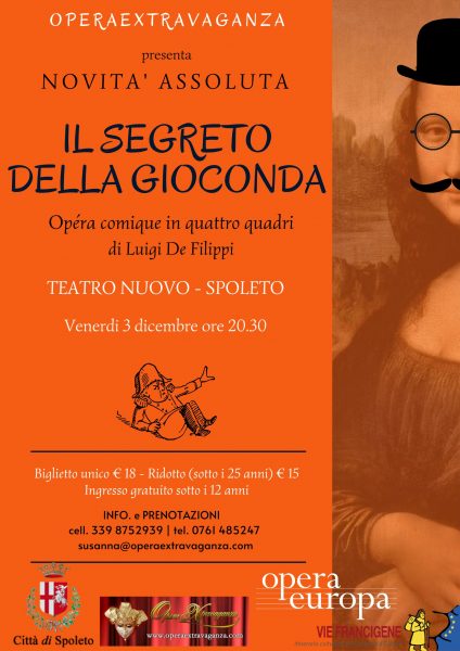 Il Segreto della Gioconda è uno stravagante incontro di personaggi storici di primo piano, come Napoleone, Pio VII, Elisa Bonaparte, Niccolò Paganini, intrecciati e mossi da un fatale equivoco. Come Opéra Comique coniuga la levità dell’operetta con il rigore storico degli eventi in esso contenuti, e si snoda sulla via Francigena, iniziando a Vetralla, continuando a Lucca, e finendo a Besançon.