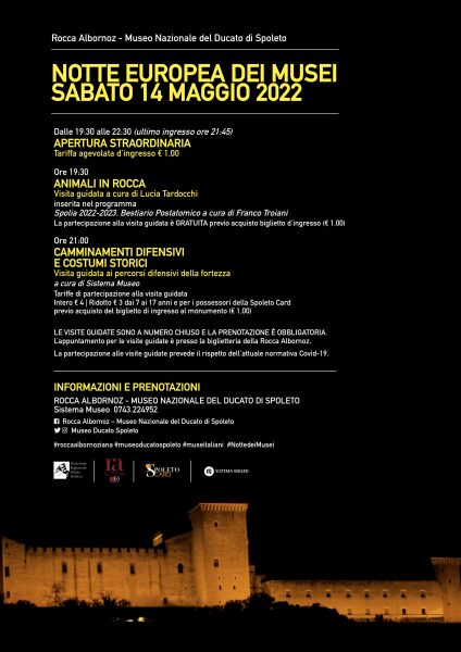In occasione della Notte Europea dei Musei 2022 che si terrà sabato 14 maggio, la Rocca Albornoz e il Museo Nazionale del Ducato di Spoleto rimarranno aperti in via straordinaria dalle ore 19:30 alle ore 22:30 (ultimo ingresso ore 21:45) alla tariffa agevolata di 1 euro.