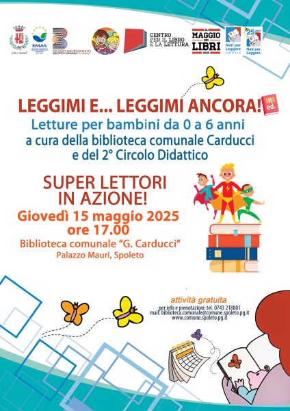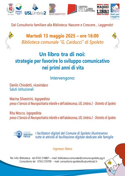 L’appuntamento è organizzato nell’ambito del Progetto “Dal Consultorio familiare alla Biblioteca: Nascere e Crescere…Leggendo!”, realizzato dalla biblioteca comunale “G. Carducci” e dal Consultorio familiare di Spoleto, da novembre 2022 ed inserito nel Programma Nati per Leggere.