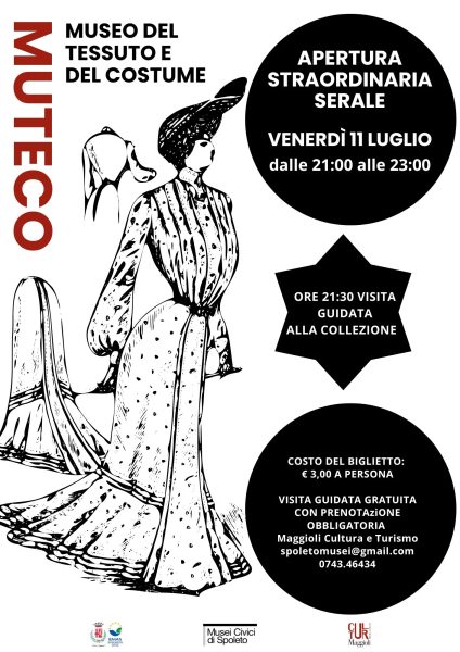In occasione del Festival dei Due Mondi, venerdì 11 luglio 2025 è in programma un’apertura straordinaria serale del Museo del Tessuto e del Costume di Spoleto, dalle ore 21 alle 23.