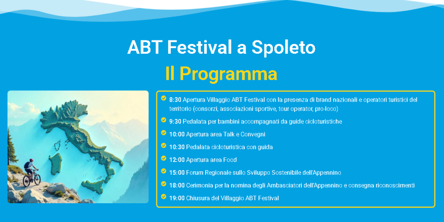 Domenica 29 giugno Spoleto sarà sede della sesta tappa dell’ABT FESTIVAL 2025 – Appennino Bike Tour Festival, tour nazionale che attraverserà l’Italia durante il quale saranno presentate le tante eccellenze dell’Appennino con l’organizzazione di talk, convegni e attività di avviamento alla bicicletta per bambini.