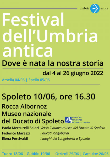 Venerdì 10 giugno la Rocca Albornoz di Spoleto ospiterà, alle ore 16.30, un incontro con Federico Marazzi, che parlerà dei ducati longobardi, Elena Percivaldi, che si soffermerà sui luoghi spoletini dei Longobardi, e Paola Mercurelli Salari, direttrice del Museo nazionale del Ducato di Spoleto-Rocca Albornoz, del Tempietto sul Clitunno e di Palazzo ducale di Gubbio, che incentrerà il proprio contributo sul nuovo museo del Ducato di Spoleto.