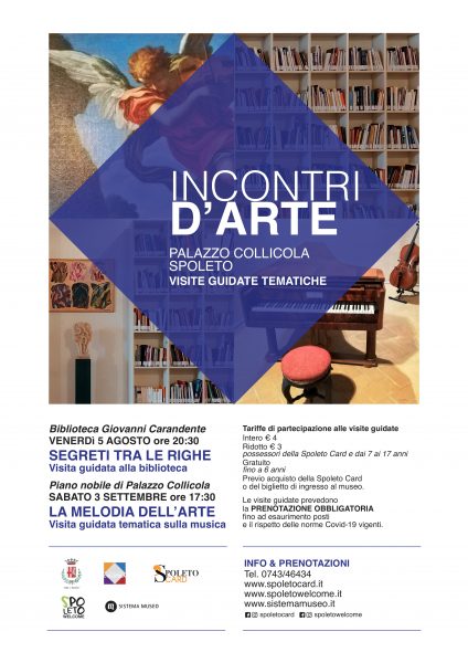 Sistema Museo in collaborazione con la Direzione di Palazzo Collicola e l’Assessorato alla Valorizzazione delle culture, della qualità e della bellezza della Città e del territorio del Comune di Spoleto, propone Incontri d’arte a Palazzo Collicola, due visite guidate tematiche programmate in occasione di alcuni degli appuntamenti della rassegna “Accade d’estate a Spoleto” previsti a Palazzo Collicola.
