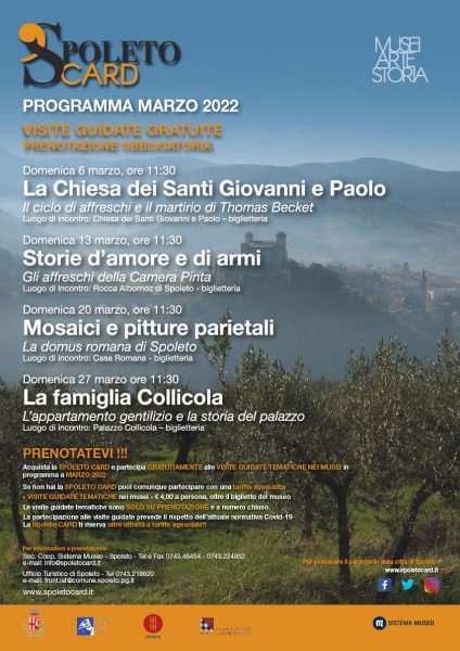 Gli appuntamenti settimanali, in calendario fino al 31 marzo 2022, sono previsti nei sei musei della rete Spoleto Card: la Rocca Albornoz – Museo Nazionale del Ducato, il Museo Archeologico Nazionale e Teatro Romano, Palazzo Collicola, la Casa Romana, la Chiesa dei Santi Giovanni e Paolo e il Tempietto sul Clitunno.