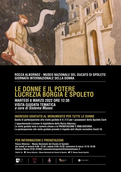 Alla Rocca Albornoz – Museo nazionale del Ducato di Spoleto, alle ore 12.30, sarà effettuata una visita guidata dedicata ad una delle figure femminili più discusse della storia, Lucrezia Borgia, che fu governatrice di Spoleto dove soggiornò alla fine del XV secolo.