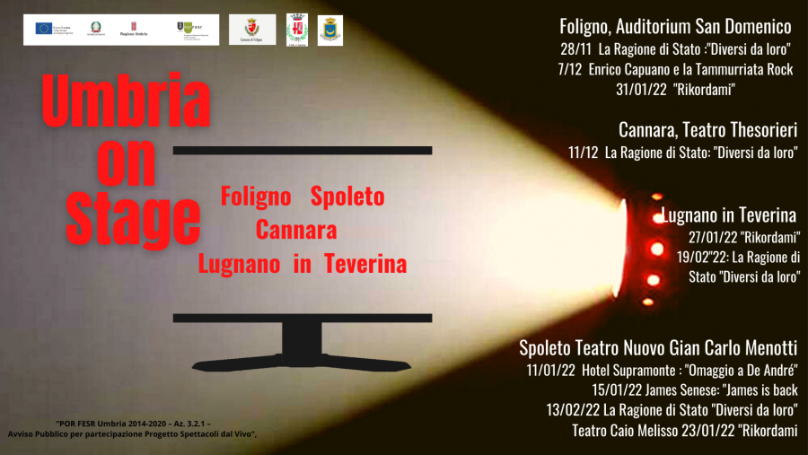 UMBRIA ON STAGE è un progetto per la realizzazione di spettacoli dal vivo promosso e realizzato dall’associazione Athanor Eventi con il sostegno del “POR FESR Regione Umbria 2014-2020 Asse 3 – Obiettivo specifico 3.2 – Azione 3.2.1 – Bando per il sostegno di progetti nel settore dello spettacolo dal vivo”. Il progetto prevede la diffusione nelle due provincie di Perugia e Terni di una serie di spettacoli che si realizzeranno tra il mese di novembre 2021 e febbraio 2022 negli spazi invernali cittadini più significativi di Foligno, Spoleto, Lugnano in Teverina e Cannara.