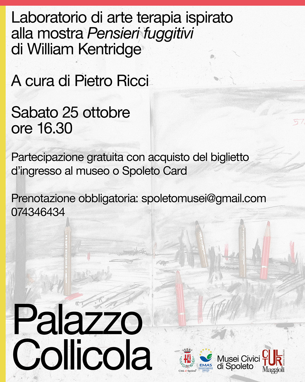 Palazzo Collicola di Spoleto si conferma un punto di riferimento per la sperimentazione culturale e la promozione del dialogo tra arte, emozione e comunità. Sabato 11 e 25 ottobre 2025, alle ore 16.30, si terranno due laboratori dal titolo Arte terapia a Palazzo, condotti da Pietro Ricci, arteterapeuta, che guiderà i partecipanti in percorsi esperienziali ispirati alle mostre in corso.